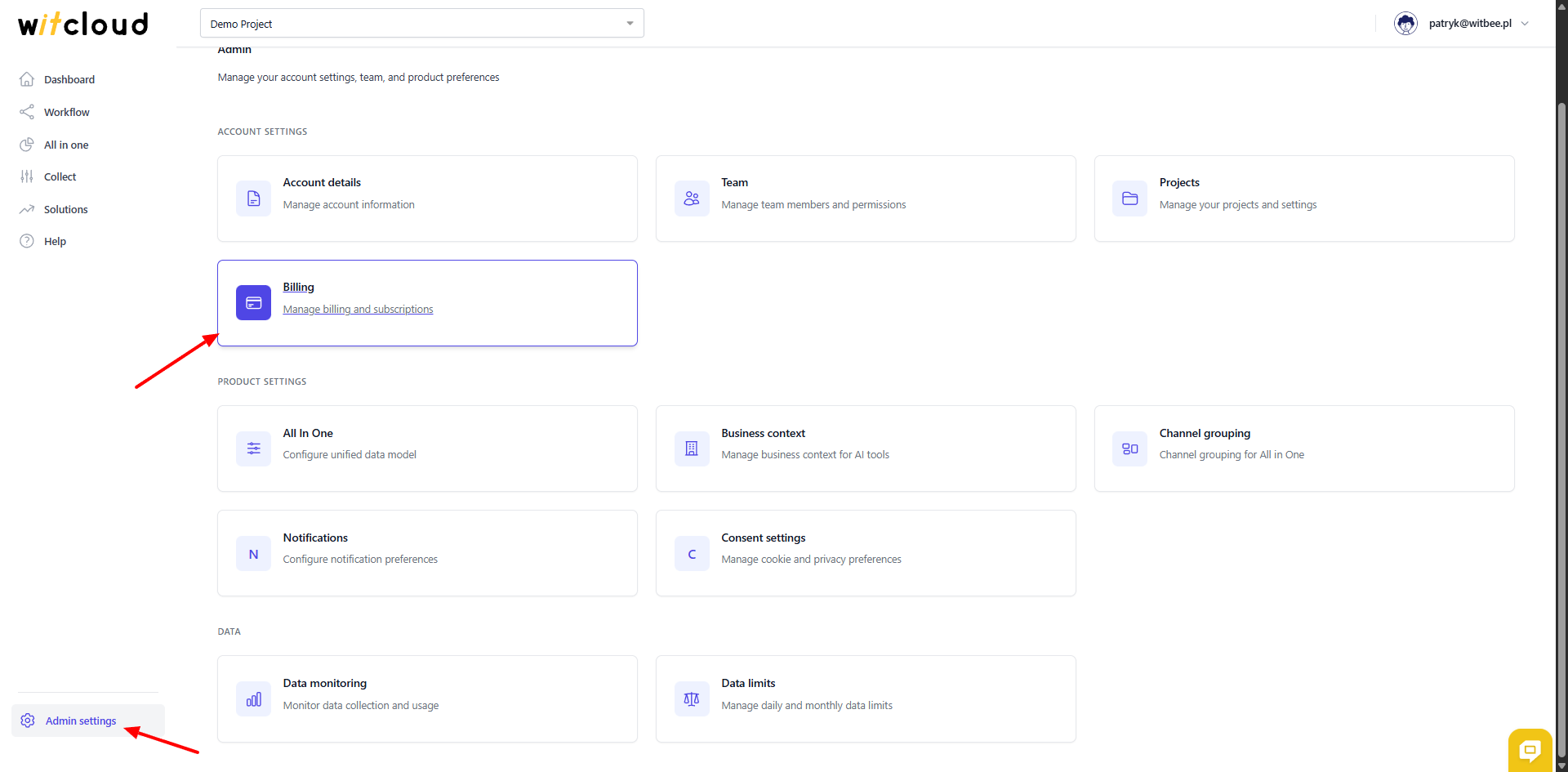 Po zalogowaniu na platformę przejdź do sekcji rozliczeń, klikając w przycisk Admin settings > Billing znajdujący się w lewym dolnym rogu panelu.