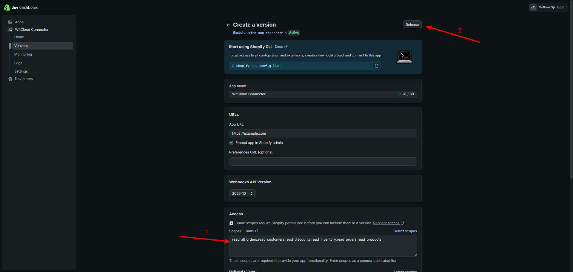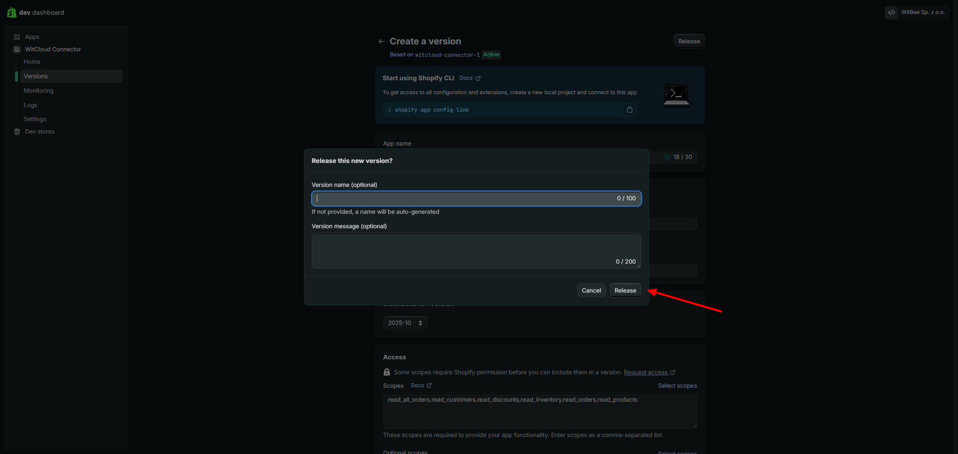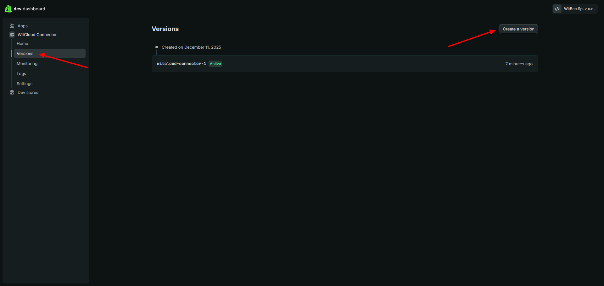 Wróć do Dev Dashboard i przejdź do sekcji Versions. Kliknij Create a version, aby utworzyć nową wersję aplikacji z wymaganymi zakresami uprawnień.