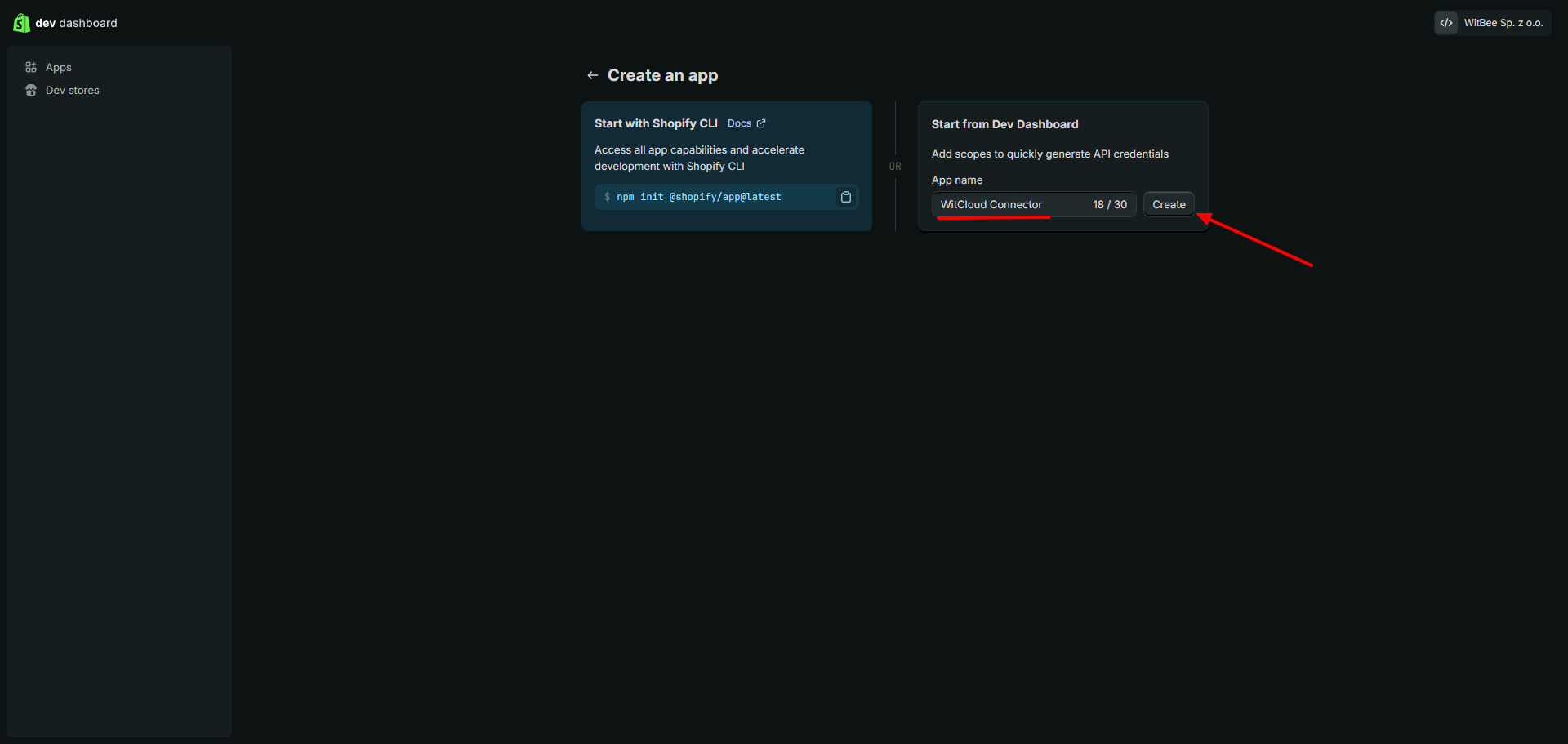 Na ekranie „Create an app” wybierz po prawej stronie opcję Start from Dev Dashboard. Wpisz App name (np. „WitCloud Connector”) i kliknij Create.