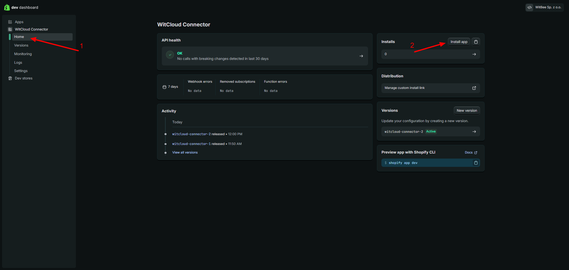 Przejdź do sekcji Home swojej aplikacji i kliknij Install app, aby zainstalować ją w swoim sklepie.