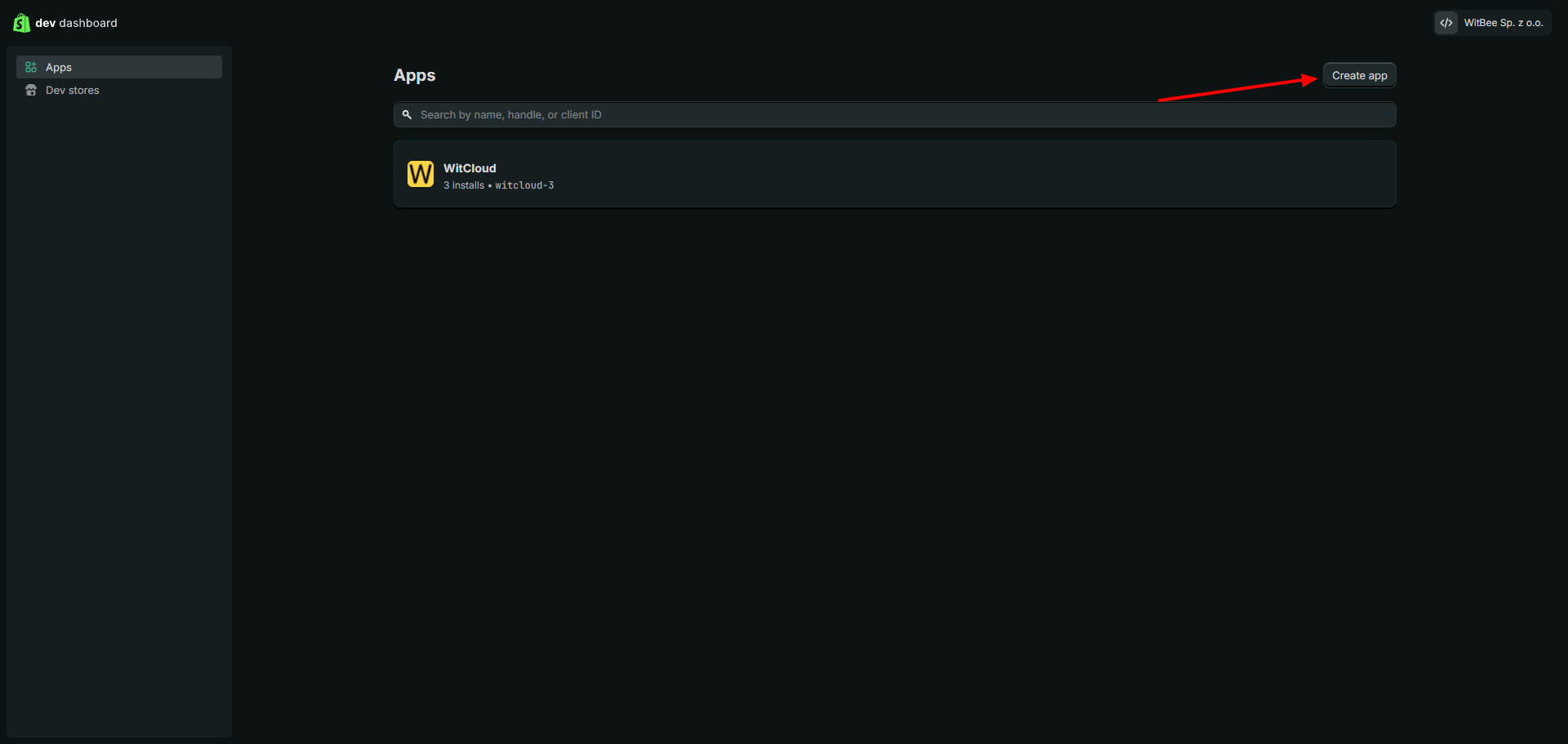 Przejdź do Shopify Dev Dashboard i wejdź do sekcji Apps. Kliknij Create app w prawym górnym rogu.