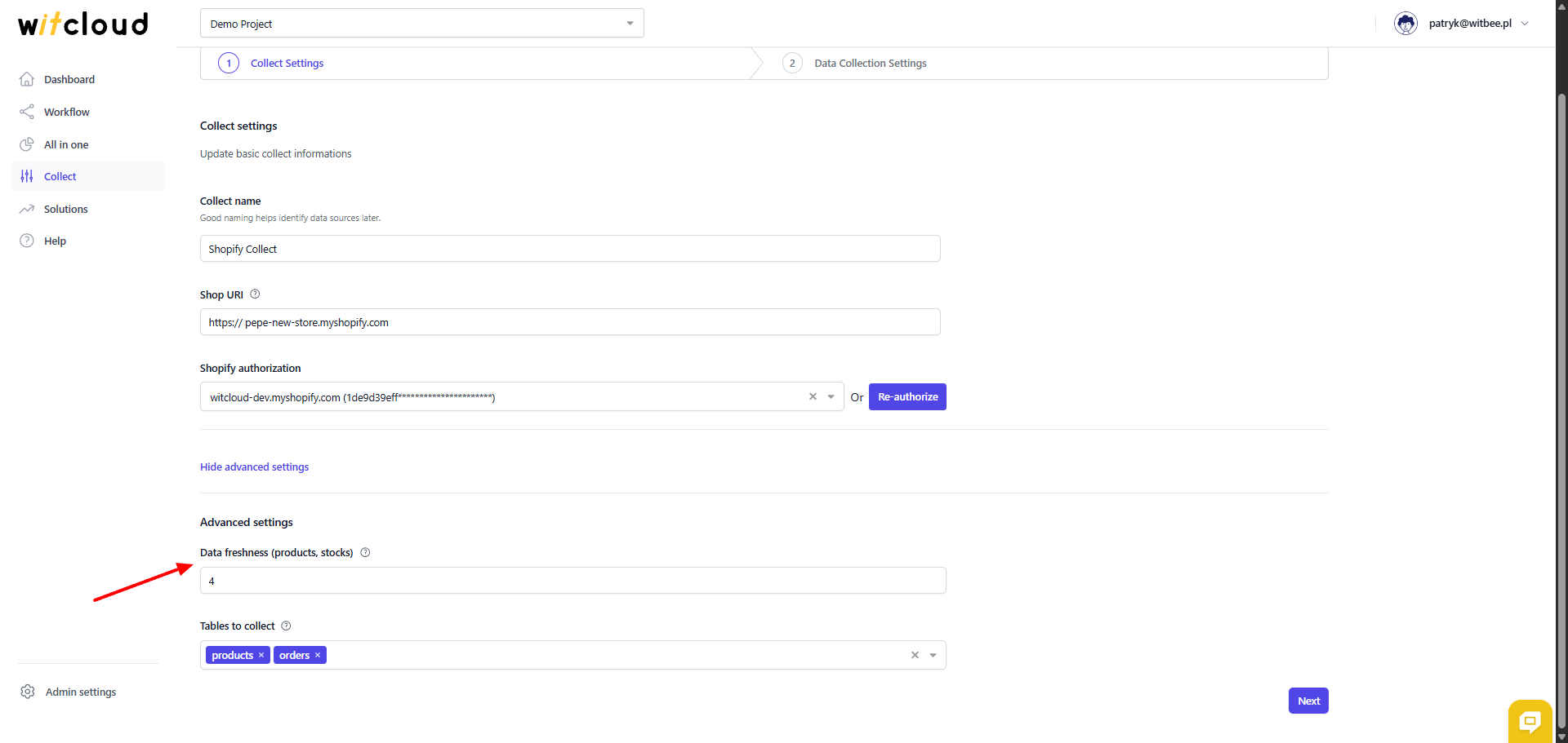 Niektóre tabele, które przechowują pełną historię danych — takie jak produkty czy stany magazynowe — są odświeżane rzadziej; możesz dostosować to ustawienie w polu Data freshness.