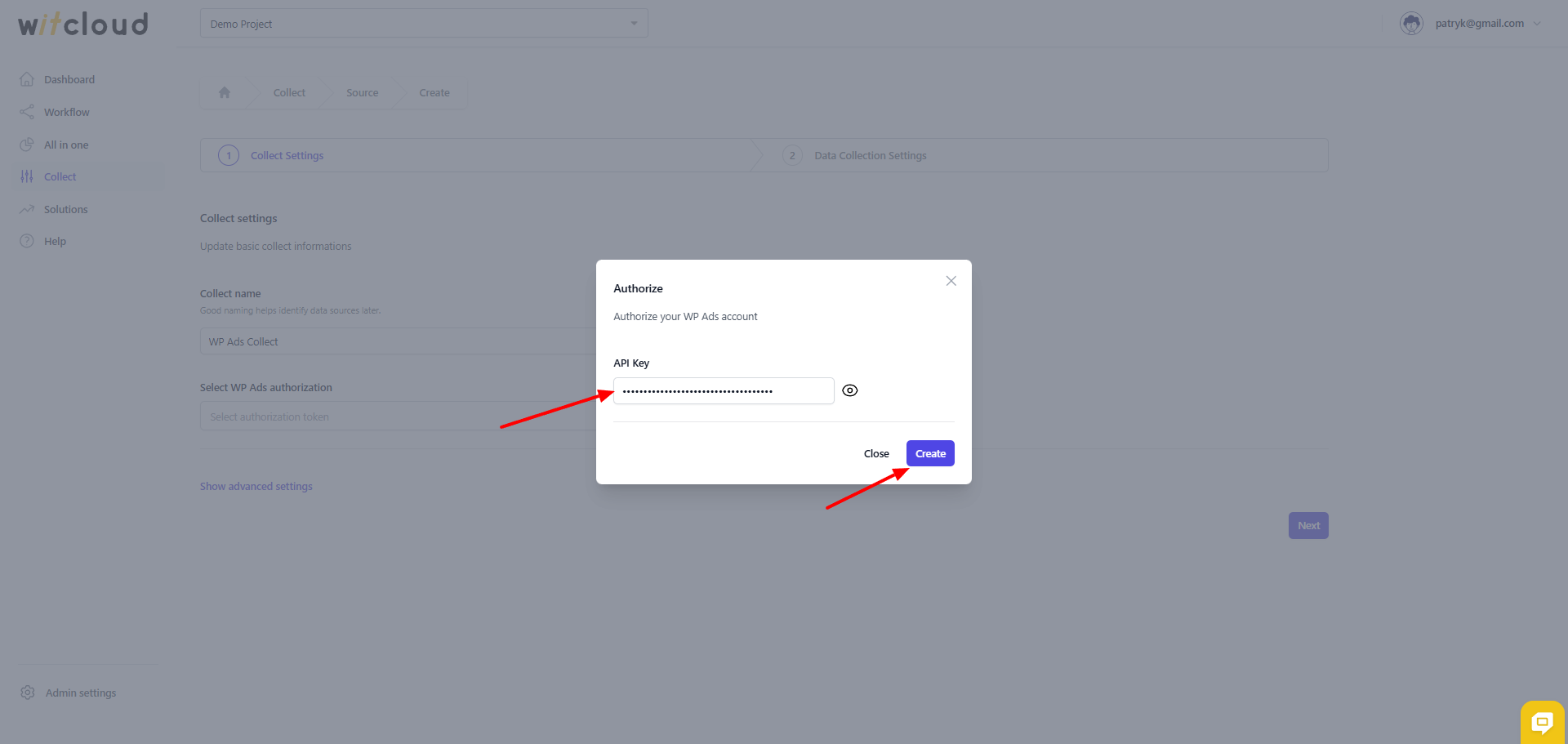 W formularzu autoryzacji wklej klucz API wygenerowany w panelu WP Ads.