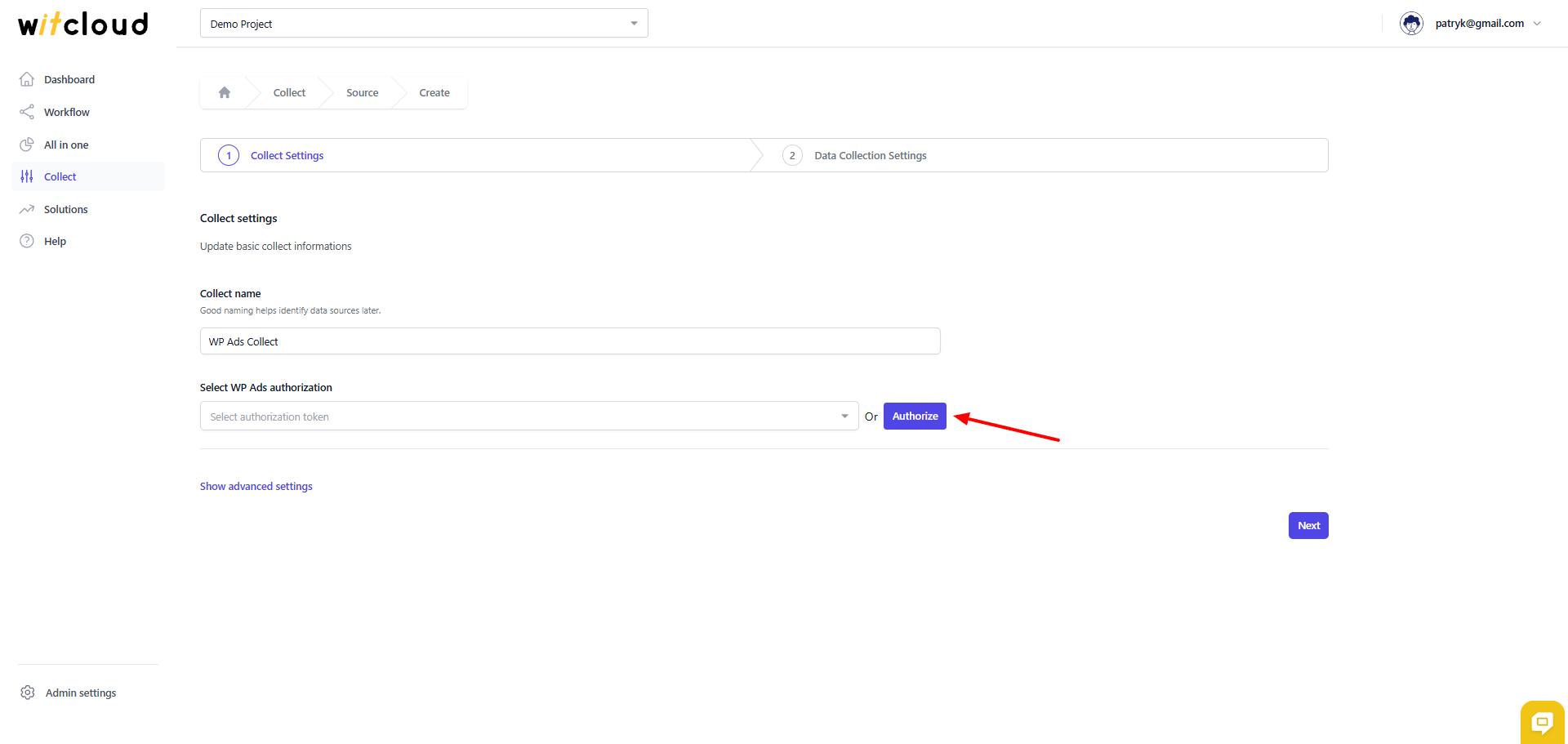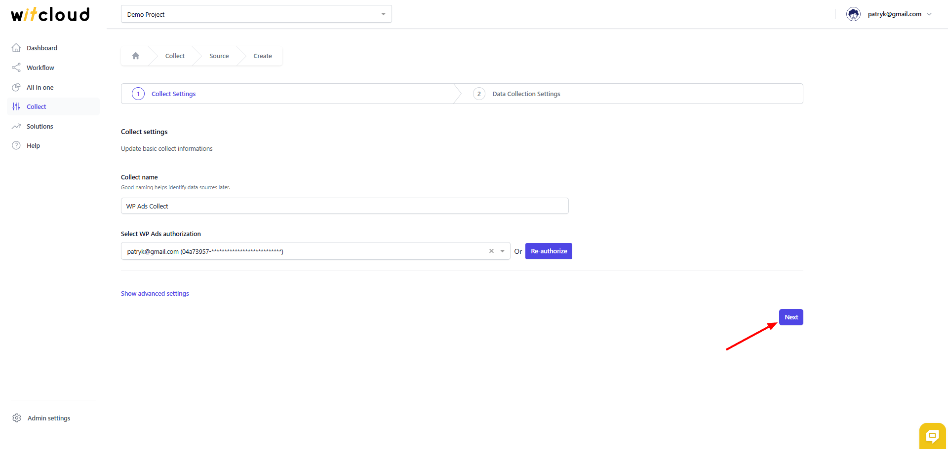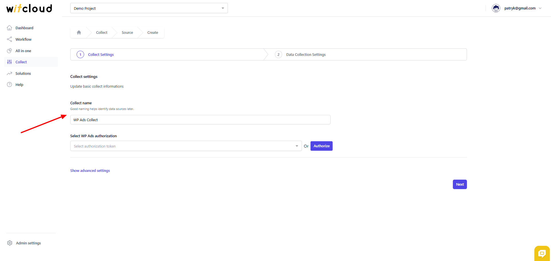 Wprowadź Collector Name, np. "WP Ads Collect".