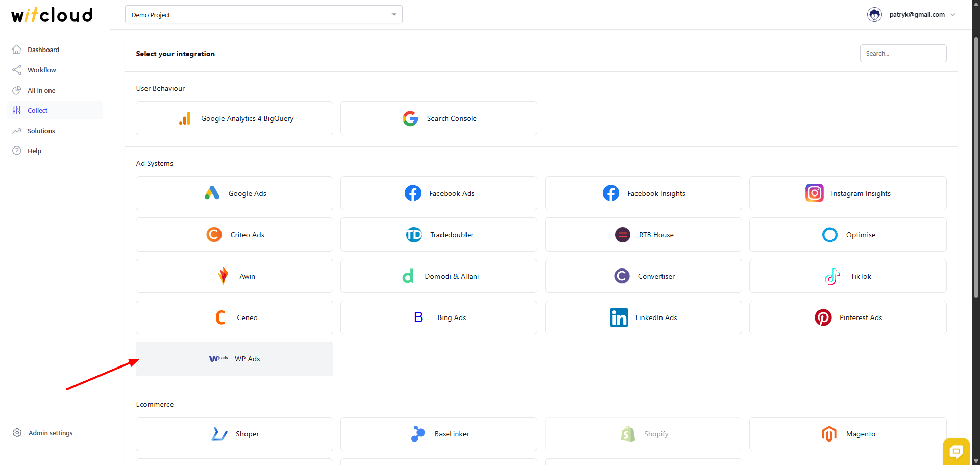 Z listy dostępnych integracji wybierz WP Ads.