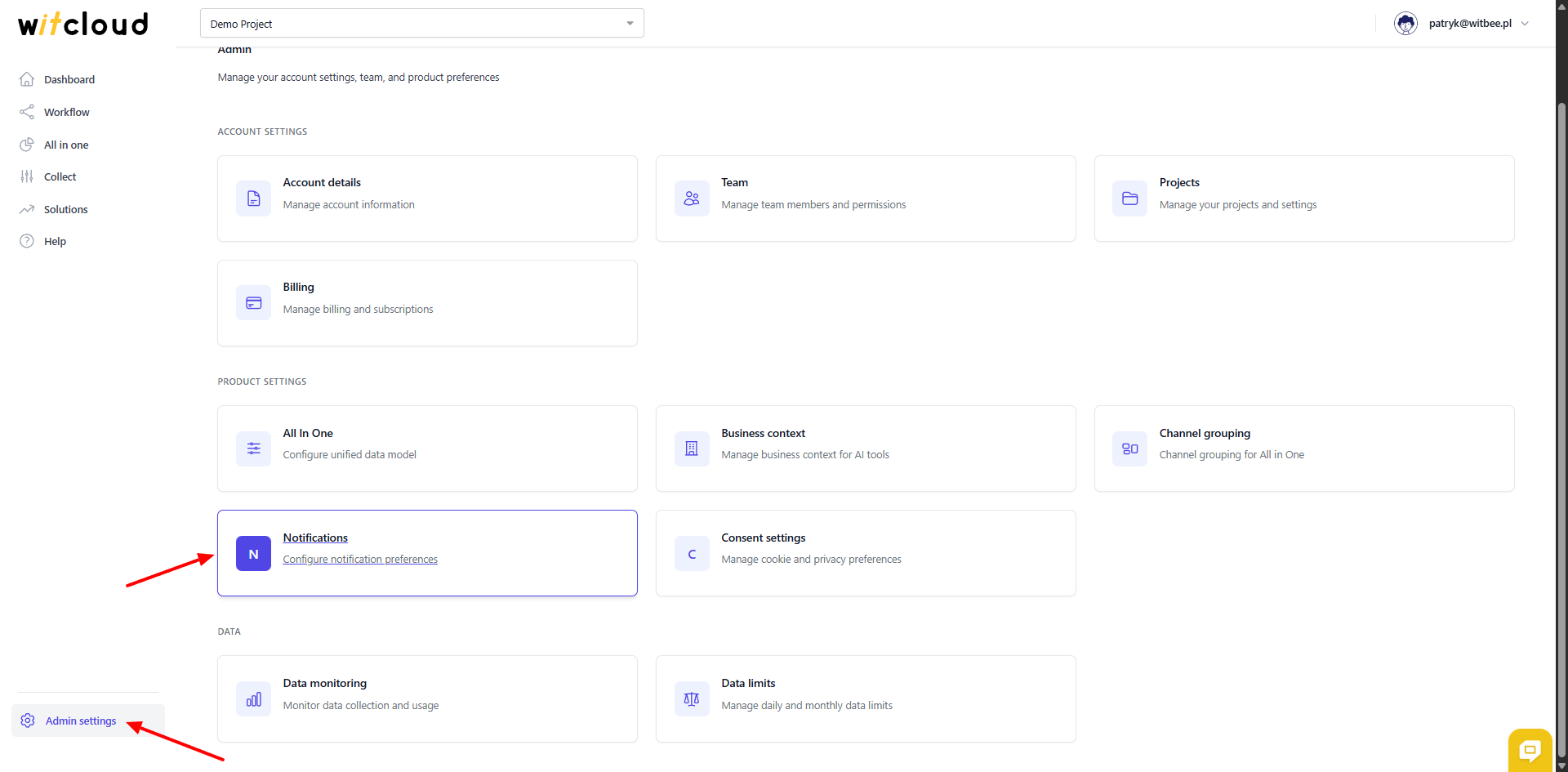Aby skonfigurować powiadomienia, przejdź do sekcji Admin settings > Notifications w menu po lewej stronie panelu administracyjnego.